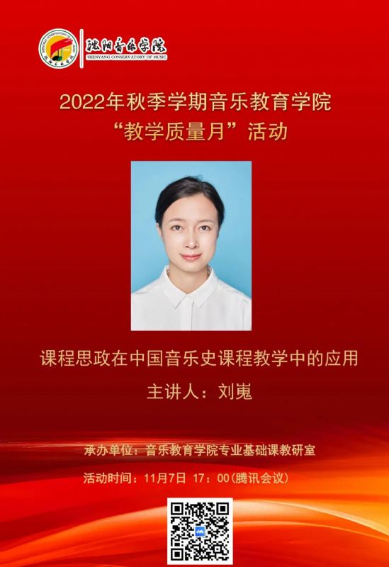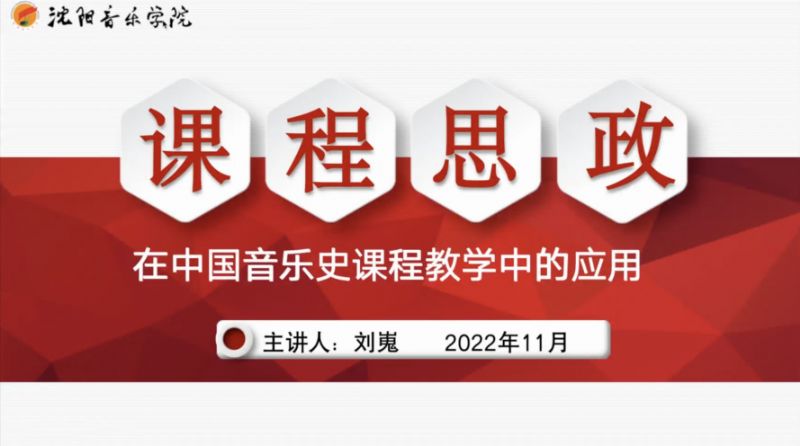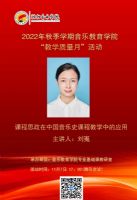 2022年11月7日下午17时, 2022年秋季学期音乐教育学院“教学质量月”系列活动之《课程思政在中国音乐史课程教学中的应用》公开课在线上如期举行。由专业基础课教研部刘嵬教授担任主讲。