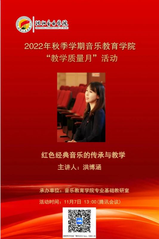 2022年11月7日,音乐教育学院专业基础课教研室洪博涵老师以腾讯会议形式在线举办了《红色经典音乐传承与教学应用》教学公开课。
