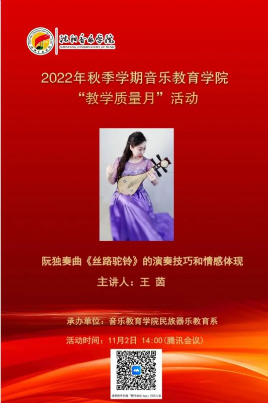 11月4日14:00音乐教育学院民族器乐教育系以线上形式开展了教学质量月系列活动——《阮独奏曲<丝路驼铃>的演奏技巧和情感体现》,主讲人为王茵老师。
