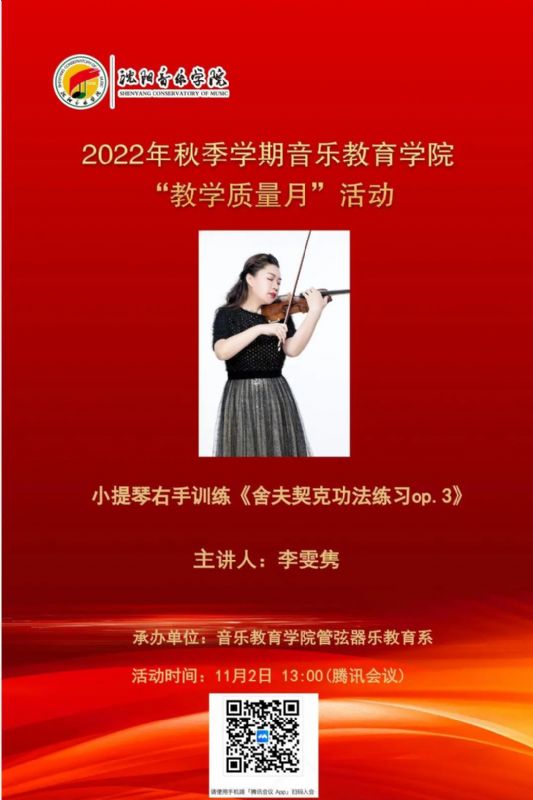 为进一步提升教学质量,积极推动教学方法和教学手段的创新,打造有效课堂,音乐教育学院管弦器乐教育系以网络公开课形式于11月2日组织开展2022年“教学质量月活动”——小提琴右手训练公开课程。主讲人系小提琴专业副教授李雯隽老师,管弦器乐教育系弦乐师生共同参与了此次活动。
