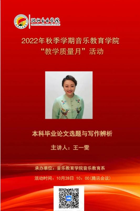音乐教育系于2022年10月28日10:00,采用腾讯会议的形式,开展了教学质量月系列活动——《本科毕业论文选题和写作辨析》,主讲人王一雯。本次活动首先介绍了学士学位论文的性质、定义,并由此引出论文选题要“以小见大”;其次,讲座对音乐教育方向的学位论文从学科分类、写作方法和文体属性以及科学研究等不同视角,分别介绍了论文选题需要注意的方面及问题;最后介绍了论文正文书写需要注意的格式规范。