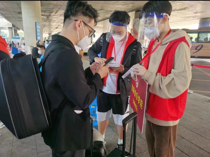 在机场、沈阳站、沈阳北站、沈阳南站等站点翘首以盼萌新的辅导员老师和志愿者们是萌新们最可靠的引路人,醒目的红马甲和标志牌,他们像夜航中的灯塔,用汗水和行动诠释担当,用爱传递温暖和关怀。