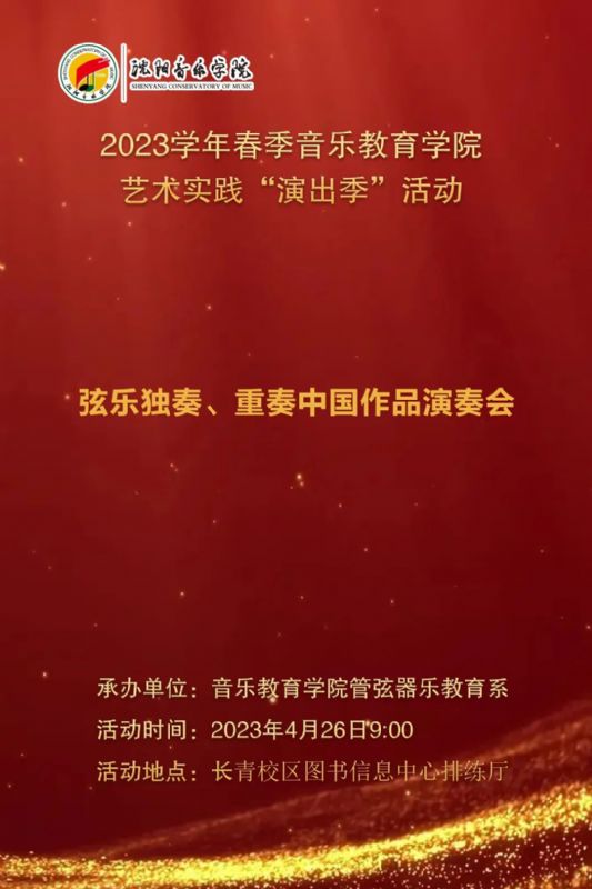 音乐教育学院管弦器乐教育系于2023年4月26日在图书信息中心排练厅举办了《弦乐独奏、重奏中国作品演奏会》活动。