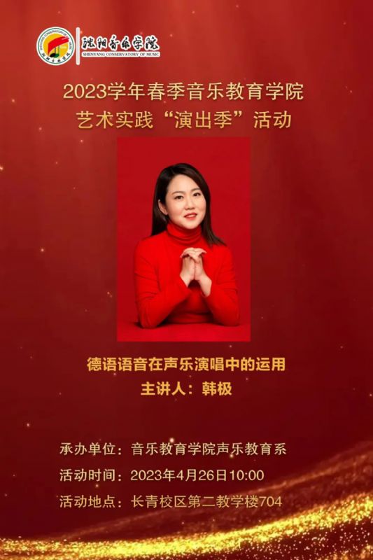 音乐教育学院声乐教育系于2023年4月26日在长青校区第二教学楼704室,开展了由韩极老师主讲的公开课——《德语语音在声乐演唱中的运用》。