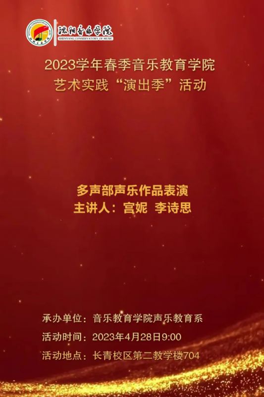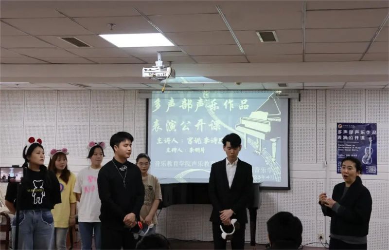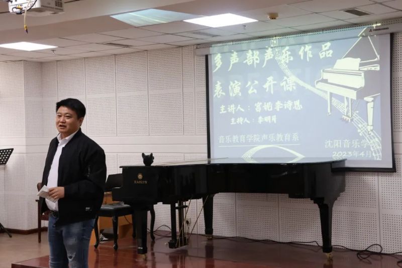 音乐教育学院声乐教育系于2023年4月28日在沈阳音乐学院长青校区第二教学楼704室,开展公开课教学活动——《多声部声乐作品表演》,主讲人为宫妮、李诗思老师。