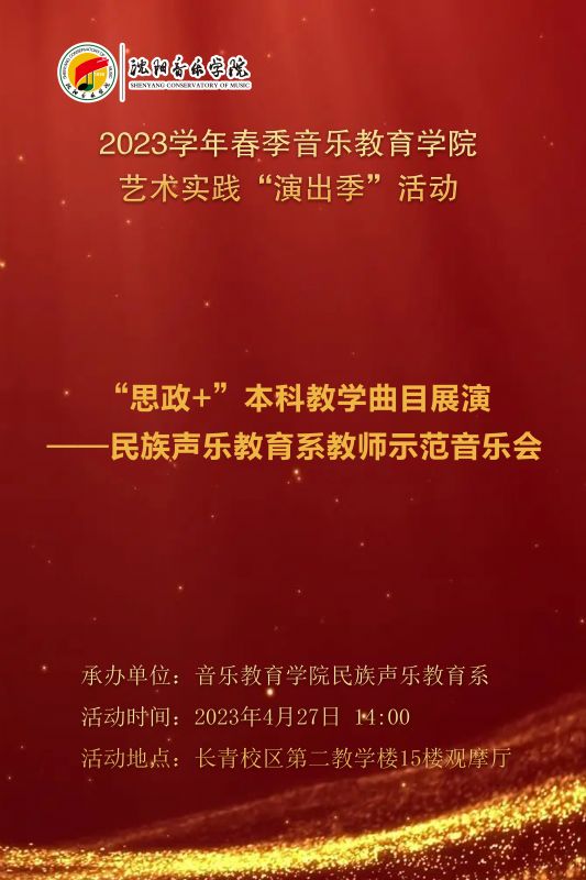 4月27日,民族声乐教育系在沈阳音乐学院长青校区第二教学楼15楼多功能厅开展了“思政+”本科教学曲目展演教师示范音乐会。