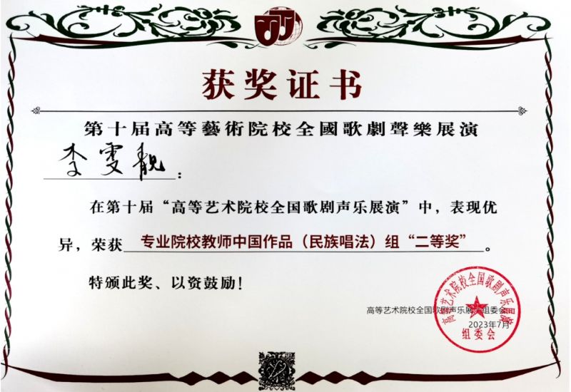 教师李雯靓荣获第十届 “高等艺术院校全国歌剧声乐展演” 专业院校教师中国作品(民族唱法)组二等奖。