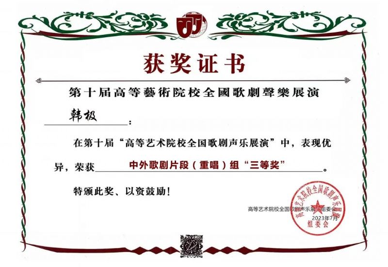 教师韩极荣获第十届 “高等艺术院校全国歌剧声乐展演” 中外歌剧片段(重唱)组三等奖。