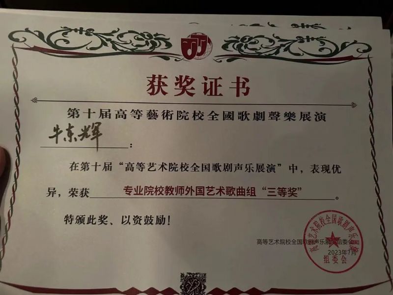 教师牛东辉荣获第十届 “高等艺术院校全国歌剧声乐展演” 专业院校教师外国艺术歌曲组三等奖。