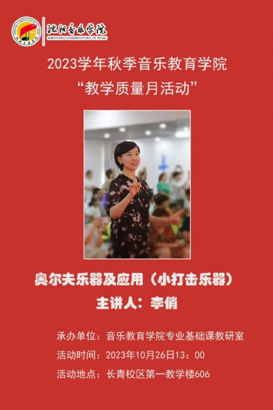 音乐教育学院专业基础课教研室于2023年10月26日13:00,在长青校区第一教学楼606教室开展了李俏老师的“奥尔夫乐器及应用—小打击乐器”的教学公开课,授课对象为21级键盘器乐教育系2班全体学生。