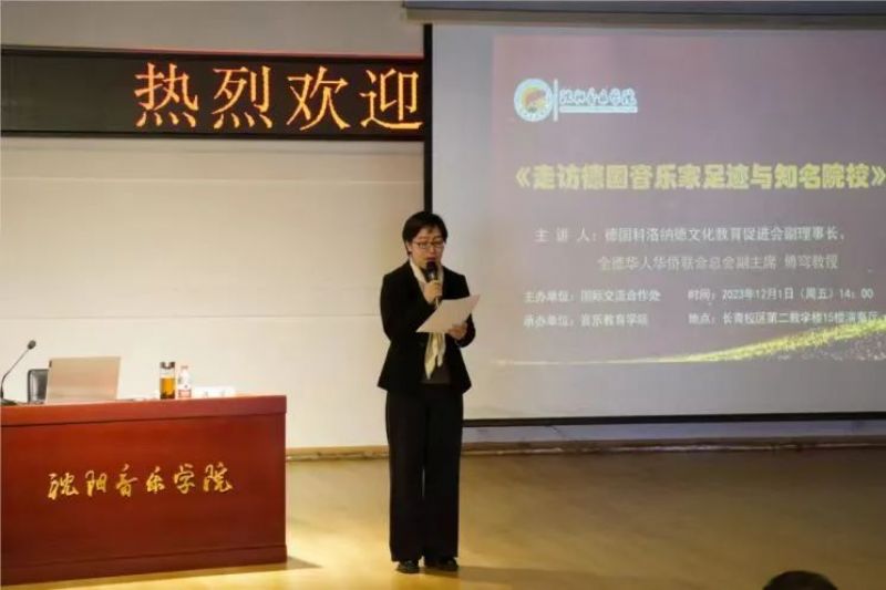 •        在沈阳音乐学院建校85周年之际,德国科洛纳德文化教育促进会副理事长、全德华人华侨联合总会副主席傅穹受邀于2023年12月1日在长青校区为音乐教育学院师生作《走访德国音乐家足迹与知名院校》的专题讲座。音乐教育学院院长吴家军、副院长孙宏娟及音乐教育学院300余名师生参加活动,讲座由音乐教育学院副院长孙宏娟主持。