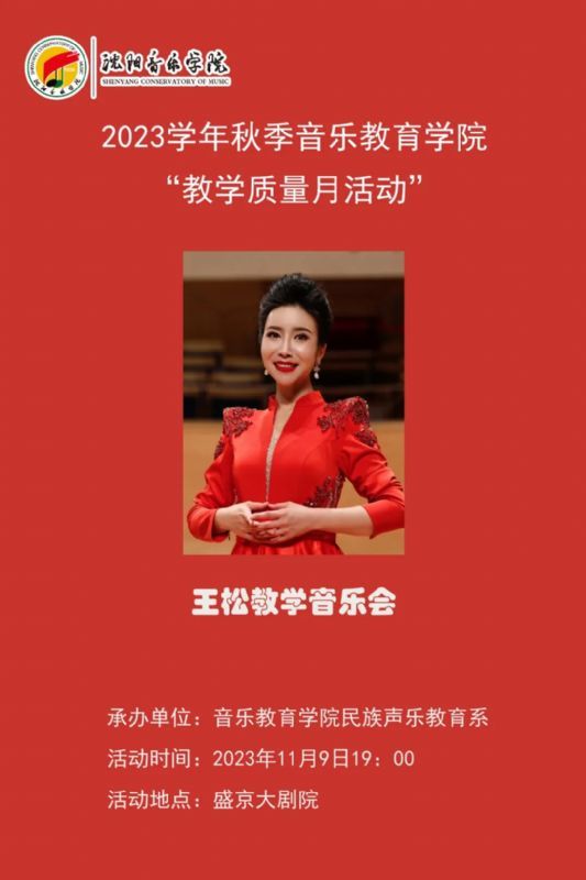 •       2023年11月9日19时,音乐教育学院民族声乐教育系教师王松在盛京大剧院举办了《“声韵流芳 乐动心海”王松教学音乐会》。音乐教育学院副院长孙宏娟、民族声乐教育系主任张晶晶及各系师生观看此次音乐会。