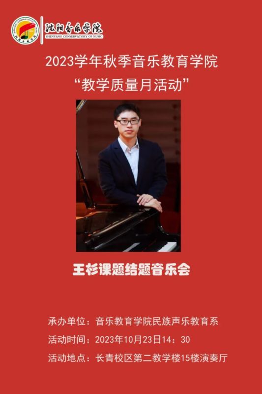 2023年10月23日在沈阳音乐学院长青校区第二教学楼15楼演奏厅,民族声乐教育系王杉老师举办了“红色歌曲在艺术指导实践中思政作用的探究”结题音乐会。