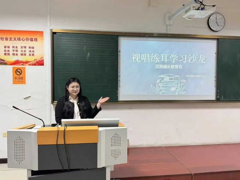 民族器乐教育系开展“乐动我心,节奏之林—视唱练耳学习沙龙”活动,以此提高同学们对音乐基础技能课程的重视和兴趣。本次活动分为视唱练耳讲座、问题答疑、基本理论讲解三个环节,同学们在活动中采取接龙的形式进行视唱及听音训练,视唱的过程中按照要求边唱边打拍子。此次活动让同学们在“练中学、学中唱、唱中听”,逐步提高学生的视唱练耳能力。