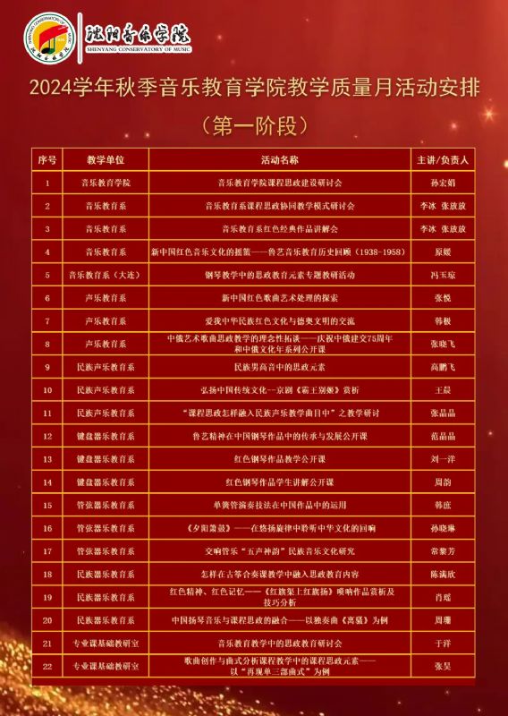 立德树人是高等学校的根本任务,课程思政建设是落实立德树人根本任务的重要途径。音乐教育学院组织开展2024年秋季“教学质量月”系列活动,把课程思政作为大思政建设、提高立德树人质量的切入点,充分发挥课堂教学育人的主渠道、主阵地作用,深入挖掘学院各类课程所蕴含的思政元素。此次活动共分为四个阶段,即教师公开课及教学研讨周、督导进课堂走访周、学风建设周、教学质量反馈暨名师讲堂周。