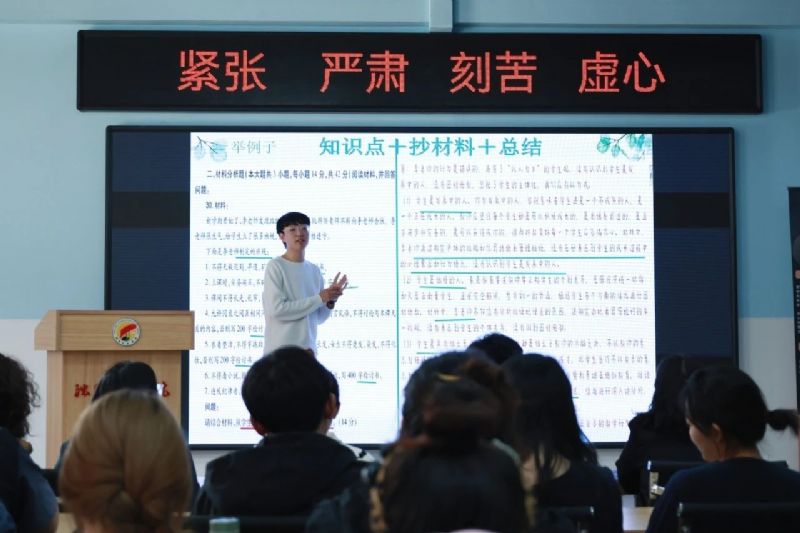在备考经验分享环节,他详细介绍了自己系统梳理3门课程大纲、精准圈定重点题型的策略,分享了每日坚持理论背诵、筑牢知识根基的学习方法。同时,他讲解了在面试备考方面,刘贺从打磨粉笔字书写技巧、优化板书设计,到面对镜子反复练习教态与语言表达,再到主动邀请师生观摩试讲、根据反馈优化教学策略,毫无保留地将自己的实战经验与同学们分享。