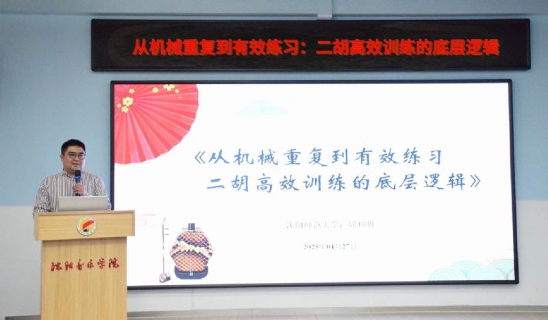 •       2025年4月27日,沈阳师范大学戏剧艺术学院周和明教授应邀为音乐教育学院师生进行了一场题为《从机械重复到有效练习:二胡高效训练的底层逻辑》的专题讲座。音乐教育学院领导班子成员、民族器乐教育系教师及学生等80余人参加本次活动。讲座由民族器乐教育系副主任李家仑主持。