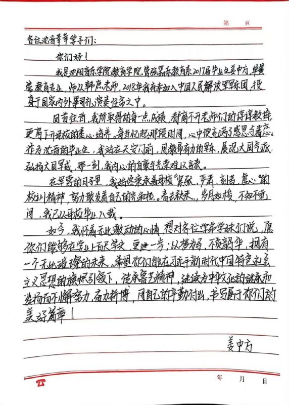作为从沈音走出来的优秀学子,姜中方始终心系母校,心系学弟学妹们。他怀着无比激动的心情,为沈阳音乐学院的莘莘学子带来了深情寄语。