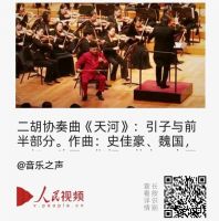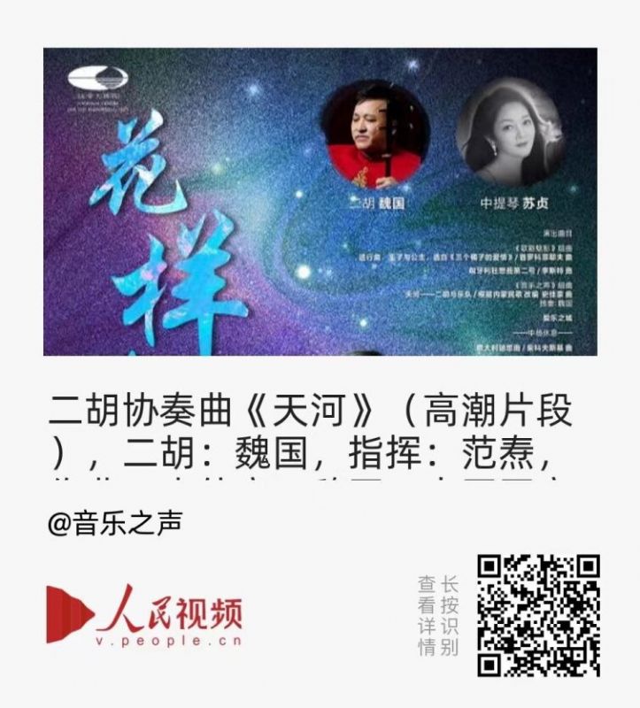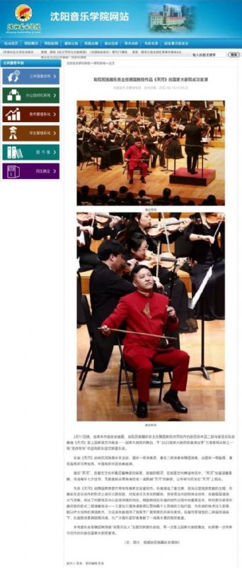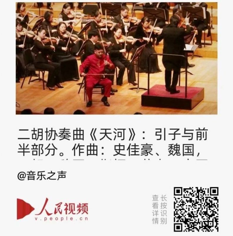 12月14日,人民网主办的人民视频@音乐之声栏目,转载由青年作曲家史佳豪、民族器乐系主任魏国教授共同创作的新民乐作品二胡与管弦乐队协奏曲《天河》。该作品由一级演奏员、著名二胡演奏家魏国独奏,由一级指挥、著名指挥家范焘指挥,中国电影乐团协奏,于2月11日“2022国家大剧院新春演出季”成功首演。