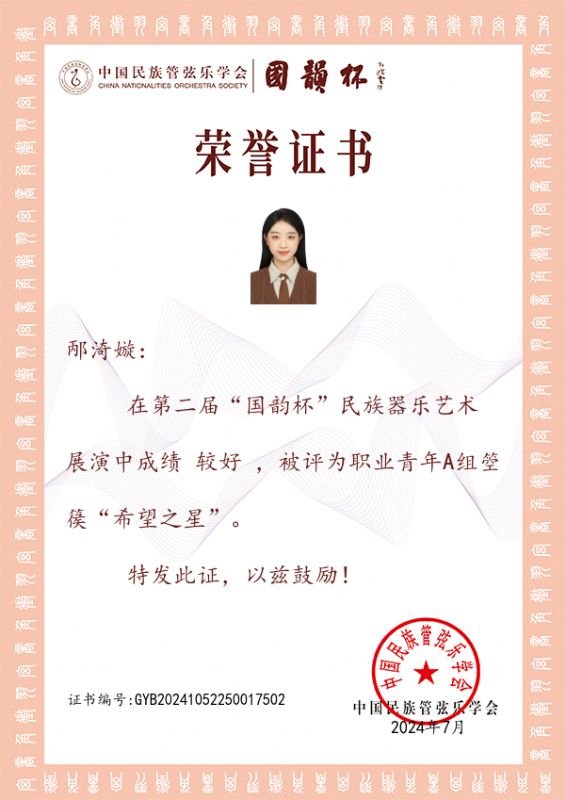近日,由中国民族管弦乐学会主办的第二届“国韵杯”民族器乐展演圆满落幕,我系7名研究生、14名本科生在职业青年A组、职业组合组斩获十四项佳绩。本次展演按成绩排序分别为:“民乐之星”“未来之星”“希望之星”和参与奖。