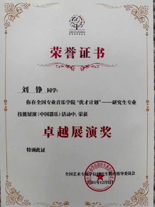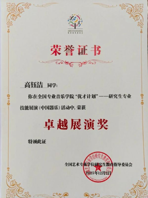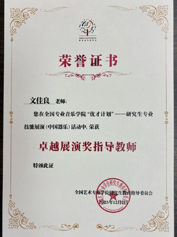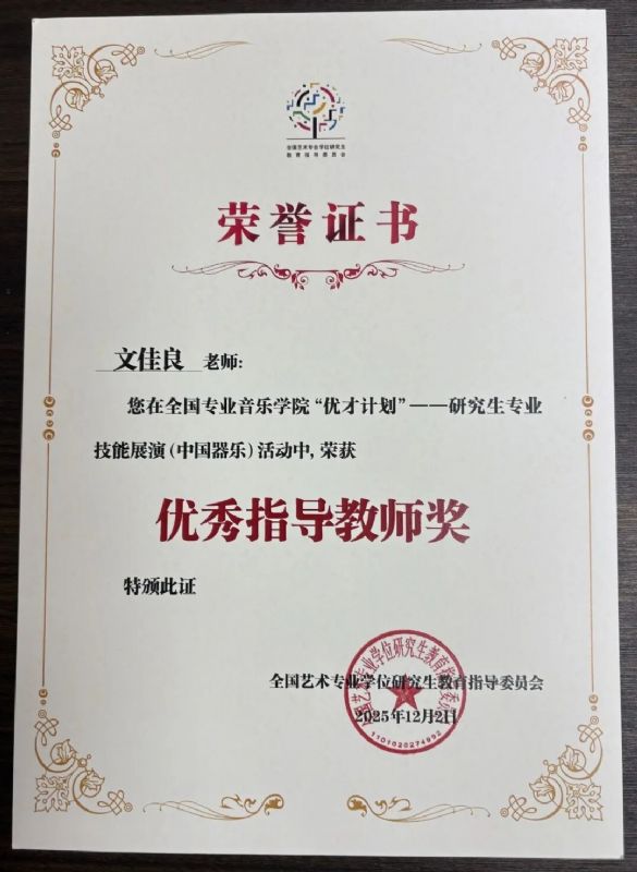 由文佳良、赵夺良指导的硕士研究生刘铮(笙协奏曲《延平郡王》)与高钰洁(二胡协奏曲《单鼓的传说》),凭借精湛技艺荣获“卓越展演奖”,两位导师获“卓越展演指导教师奖”(钢琴伴奏:汪茜、侯嘉)。此外,由文佳良、魏国指导的硕士研究生吕京松、于飞杨荣获“优秀展演奖”,导师获“优秀展演指导教师奖”。