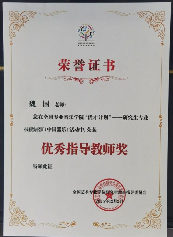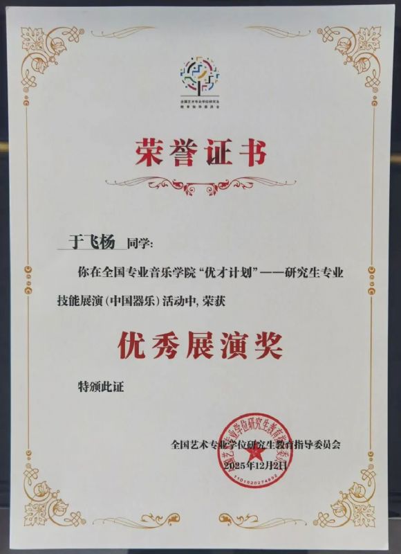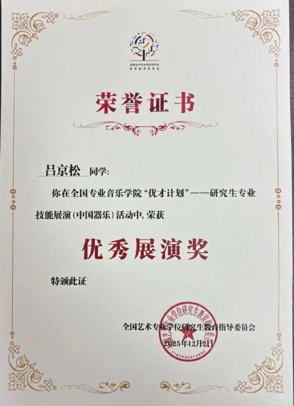 2025年12月2日至3日,由全国艺术专业学位研究生教育指导委员会主办、上海音乐学院承办的第二届全国专业音乐学院“优才计划”(中国器乐)展演活动在上海举办。本次活动旨在为全国11所专业音乐院校的在读音乐专业学位硕士研究生搭建高规格的艺术实践与学术交流平台,推动院校间互动互鉴,共同促进音乐专业学位研究生教育的高质量发展。我系师生在本次展演中表现优异。