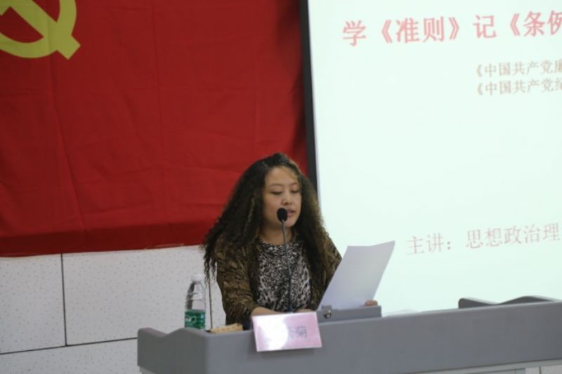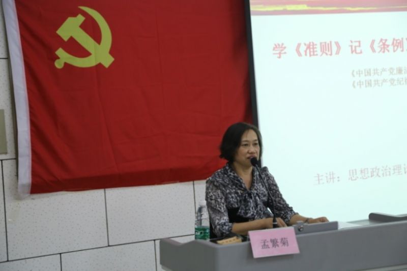 孟繁菊在党课中首先讲解了修订后的《条例》与《准则》特点:一是《准则》覆盖了全体党员,强调自律、重在立德;二是《条例》开列“负面清单”,强调他律、重在立规;三是《准则》与《条例》相互配套,重在从严治党。随后党课从“明显瘦身”“纪法分开”“从严治党”“有六大纪律‘雷区’”等四大特点,以以案说纪举例的形式讲解了八条廉洁自律准则。孟繁菊教授在党课讲到,《准则》为广大党员确立了思想和道德的高标准,是“高线”,如同“灯塔”,为广大党员指明方向。《条例》划出了党组织和党员干部的严戒尺,是“底线”,好比“警钟”,提醒党员避开危险。党员应学《准则》、记《条例》,向“高线”看齐,向“底线”说不;内化于心,外化于行,发挥模范作用,做一名合格的共产党员。