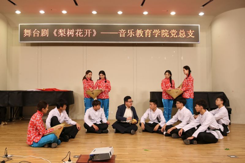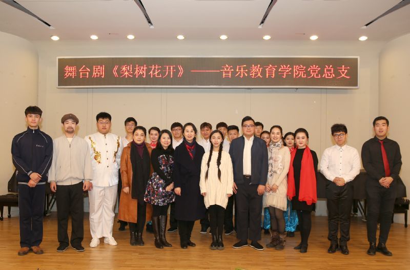 音乐教育学院党总支书记韩春凌在舞台剧结束后向全体演职人员表示祝贺。她表示,《梨树花开》是中国共产党成立九十五周年、学院深入开展“两学一做”学习教育之际,由音乐教育学院师生在短短几个月的时间里创作完成的,全体演职人员均由音乐教育学院学生担任,凝结了全院师生的智慧和汗水。