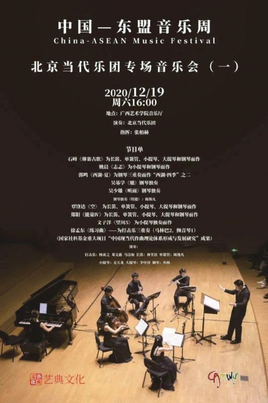 中国-东盟音乐周是由广西艺术学院主办的大型国际性音乐活动,是中国颇有影响的艺术音乐交流平台之一。本届音乐周共演出了各类音乐会10场,其中包括交响音乐会3场、民族管弦乐音乐会1场,室内乐2场。所有上演的管弦乐作品(民族管弦乐作品)及室内乐作品全部为中国当代作曲家近年来创作的新作品,分别由广西交响乐团、广西艺术学院交响乐团、广西艺术学院民族管弦乐团以及北京当代乐团担任演奏。范哲明教授的交响前奏曲《长风破浪》(2019)、吴基学教授的钢琴独奏曲《辙》(2003)分别展演其中。