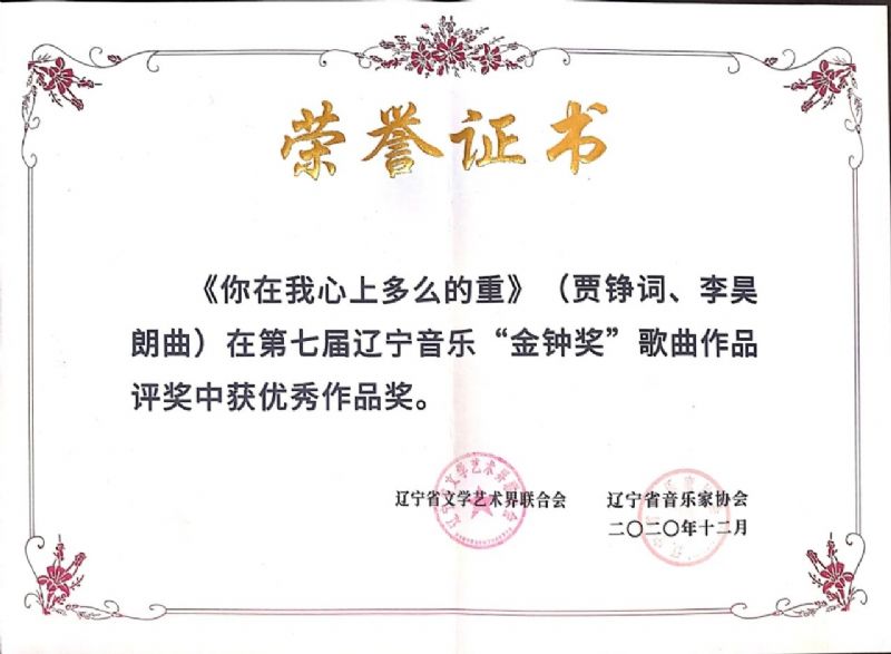 由辽宁省文学艺术界联合会、辽宁省音乐家协会共同主办的第七届辽宁音乐金钟奖评奖活动,于2020年12月10至16日在沈阳举办。经评委会两轮认真评选,最终评选出优秀歌曲作品10首。沈阳音乐学院作曲系刘晖教授、吴基学教授、李昊朗老师(戏剧影视学院教师、作曲系录音艺术专业外聘教师)荣获第七届辽宁音乐“金钟奖”优秀作品奖,特此祝贺!