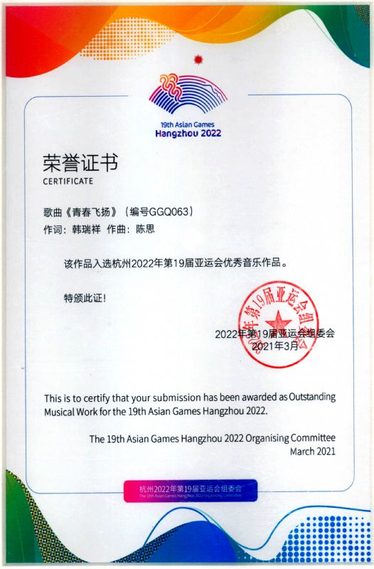 由我院作曲系作曲教研室主任陈思副教授作曲、营口市委宣传部副部长、中国音乐文学学会会员韩瑞祥作词的歌曲《青春飞扬》,入选杭州第19届亚运会优秀音乐作品。