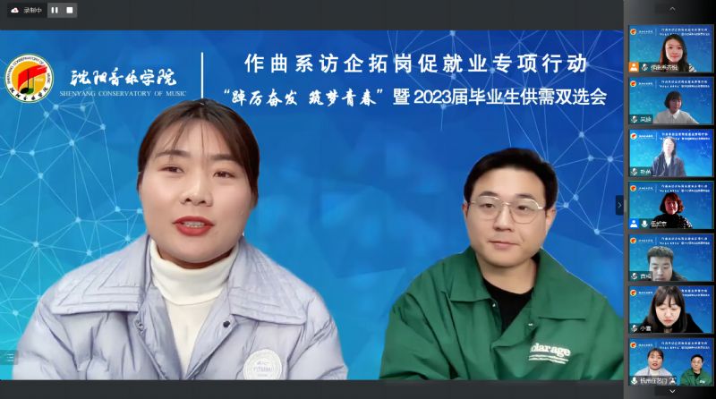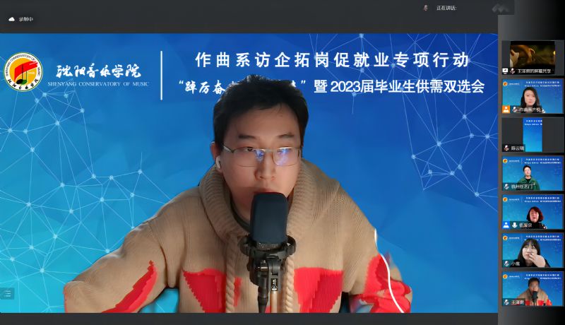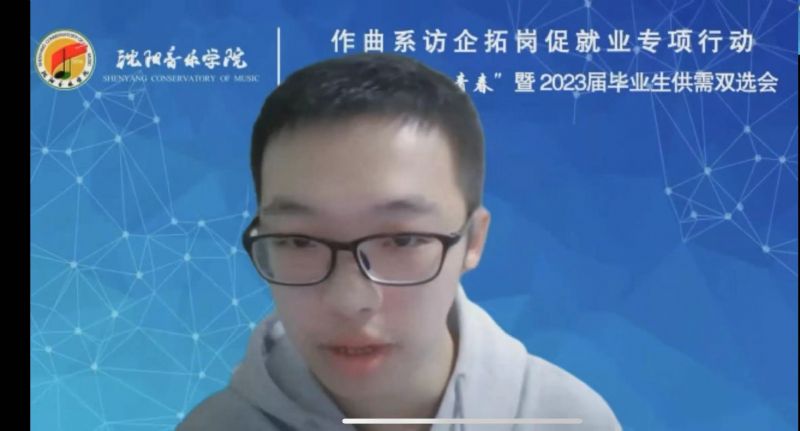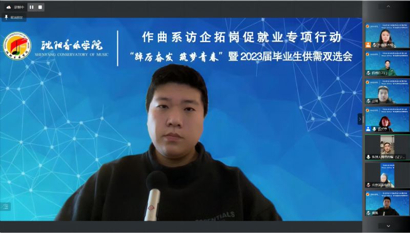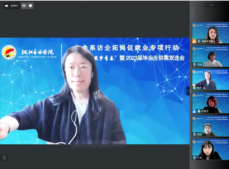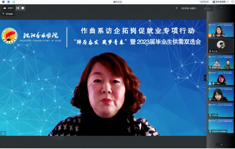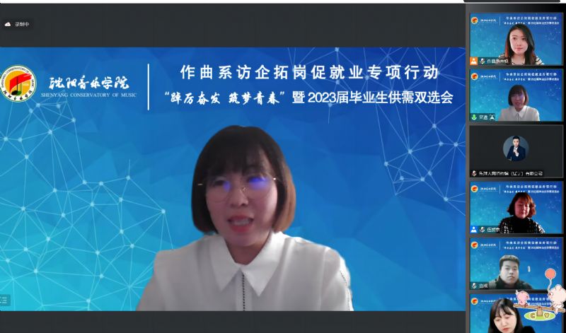 为全面贯彻落实学院《开展访企拓岗促就业专项行动实施方案》要求,进一步加强校企交流与合作,促进毕业生更加充分更高质量就业,12月7日,作曲系采用腾讯会议形式,组织开展访企拓岗促就业专项行动暨2023届毕业生供需双选会。通过视频连线的方式,与沈阳润东文化传媒有限公司、乐球人网络传媒(辽宁)有限公司、上海紫灏信息技术有限公司 、北京嘉庚音妙文化传播有限公司 、辽宁新峰文化产业集团、杭州任艺门文化创意有限公司、沈阳音动乐童教育咨询有限公司、玖月音乐科技(北京)有限公司、沈阳精思雅马哈音乐中心、北京滨滨有你文化传媒有限公司、沈阳市润泽教育科技有限公司 11家用人单位代表进行沟通交流。学院创新创业中心、就业指导中心副主任褚祎楠、作曲系领导班子全体、各教研室主任、辅导员、系秘书及全体毕业生参加了会议。会议由作曲系党总支副书记伍爱京主持。