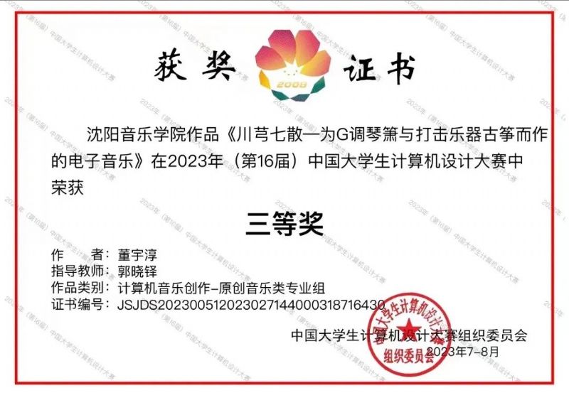 2、获奖作品:《川芎七散——为G调琴箫与打击乐器古筝而作的电子音乐》(计算机音乐创作专业组)