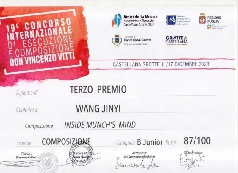 第十九届意大利唐文森佐维蒂国际音乐比赛“玛丽亚和萨维里奥·西蒙奖”作曲比赛中,我系2021级