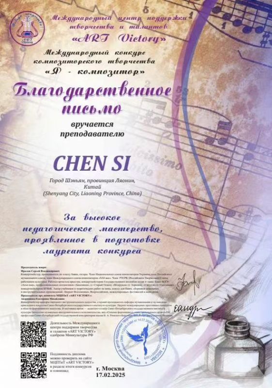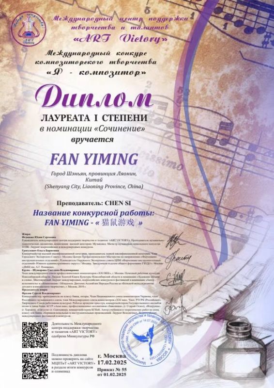 在2025俄罗斯“作曲家”国际作曲比赛中,我系2021 级本科生樊一鸣创作的室内乐作品《猫鼠游戏》获得一等奖。(指导教师:陈思)特此祝贺!