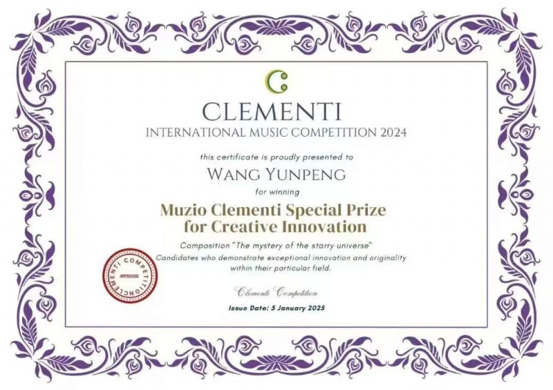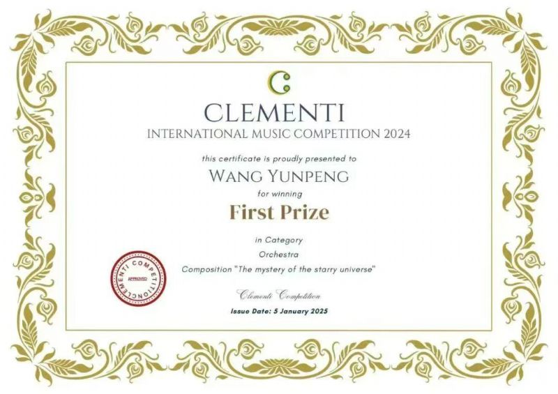 在2024年穆齐奥·克莱门蒂国际音乐比赛中,我系2022级研究生王云鹏创作的管弦乐队作品《星罗棋布的宇宙之谜》获得一等奖,同时授予创意创新特别奖(指导教师:刘晖教授)特此祝贺!