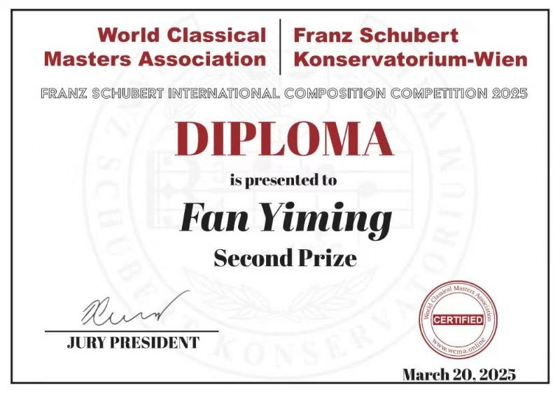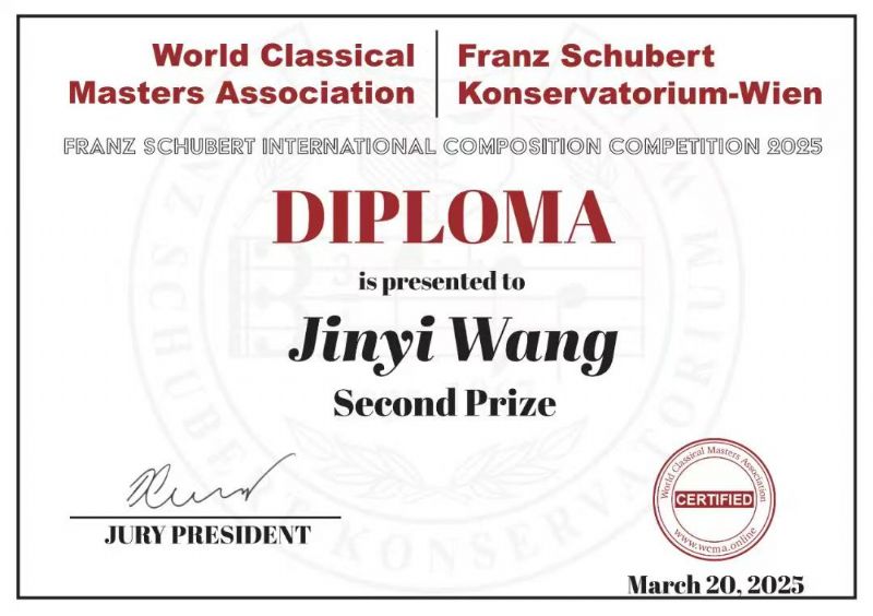 在2025年弗朗茨·舒伯特国际作曲比赛中,作曲系2021级本科生王金一创作的室内乐作品《霓虹》(指导教师:刘晖)、2021级本科生樊一鸣创作的交响乐队作品《消逝的船影》(指导教师:陈思)分别荣获二等奖。