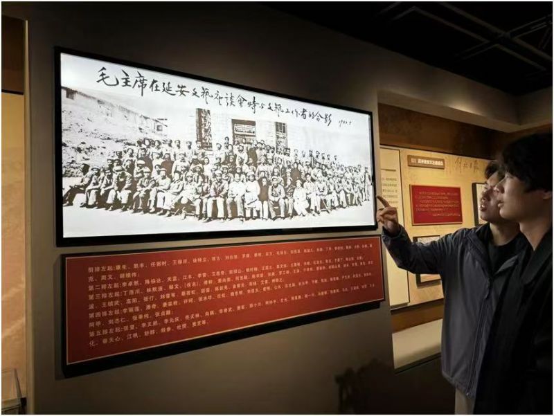 延河水畔春潮不息,山海归来桃李满庭。87年前在延河水畔、宝塔山下,鲁艺前辈们高擎中国新文艺大旗,开启了中国革命文艺教育的新纪元。在沈阳音乐学院校史馆,伴随着讲解人员的指引,两校师生瞬间被带回到延河水畔、宝塔山下那段激情燃烧的岁月。透过延安文艺座谈会的老照片、鲁艺《创立缘起》手稿、“鲁迅文艺学院”老校牌等珍贵史料,师生们深刻体会到战争年代鲁艺音乐工作者"用音符当子弹"的革命情怀。从数字化《黄河大合唱》重现到复排的歌剧《星星之火》,从场景复原的《白毛女》再到《我和我的祖国》歌曲MV,又将沈音一路走来的风雨兼程与辉煌成就娓娓道来。