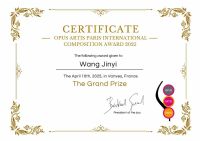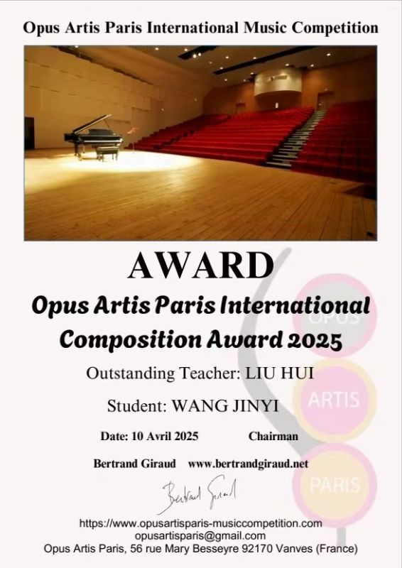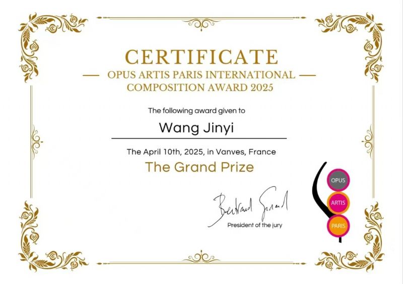 在2025年OPUS ARTIS 巴黎国际作曲比赛中,作曲系2021级本科生王金一创作的作品《Dawn》荣获特等奖。(指导教师:刘晖)