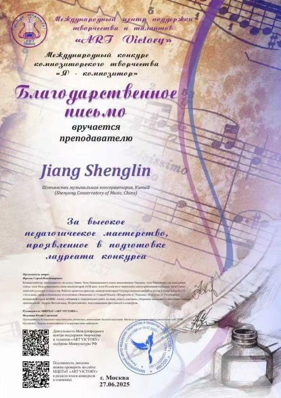俄罗斯“作曲家”国际作曲比赛由俄罗斯“ART VICTORY”国际创意和人才支持中心于2020年创办,该大赛获得俄罗斯联盟文化部认可和批准。该比赛共设立作曲、编曲、即兴创作等六个奖项,2023年主办方共收到来自世界各地70多个国家超过2000份的参赛申请。该比赛组织以其公正、透明和专业性而闻名,评审团成员来自包括俄罗斯、中国、美国、德国、比利时、挪威、瑞典、芬兰、奥地利等国的著名音乐家。
