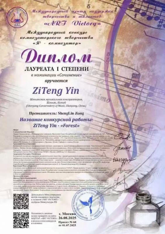 在2025年俄罗斯“作曲家”国际作曲比赛中,作曲系2021级本科生尹紫腾创作的小型乐队作品《Forest.》荣获一等奖。(指导教师:姜盛林)