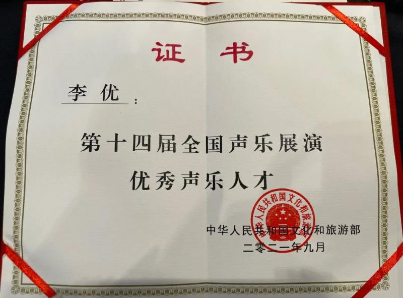 9月19日、20日晚,“全国声乐领军人才培养计划”暨第十四届全国声乐展演民族组在哈尔滨音乐厅举行。我院民族声乐系教师李优作为参加展演评比的选手,从众多选手中脱颖而出,获得了参加培养计划的资格,荣获了由中华人民共和国文化和旅游部颁发的“优秀声乐人才”证书。