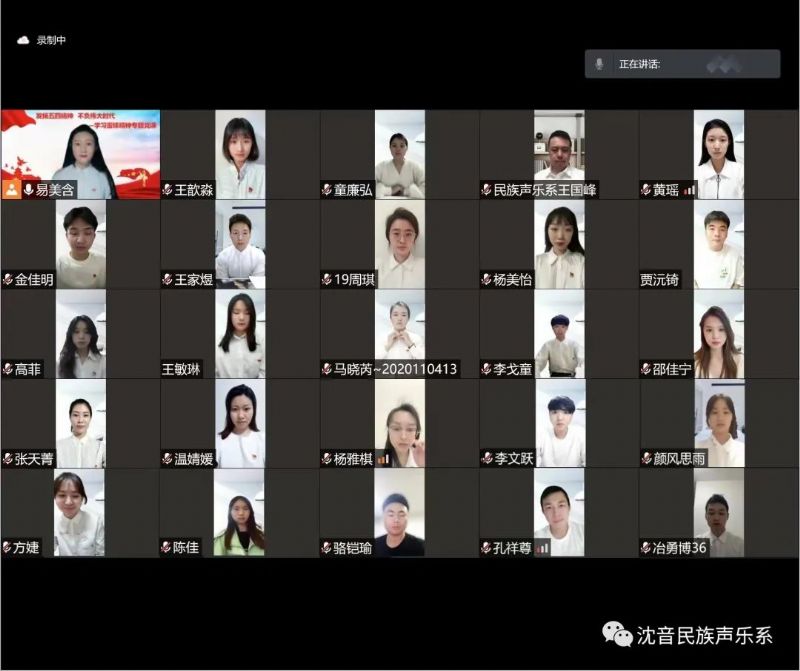 喜迎二十大,永远跟党走,奋进新征程!今年是中国共产主义青年团成立100周年,为深入贯彻习近平总书记关于弘扬雷锋精神的重要指示精神,贯彻落实《新时代爱国主义教育实施纲要》《新时代公民道德建设实施纲要》,大力培育、弘扬和践行新时代雷锋精神,持续推进民族声乐系“党建➕一年级育人工程”,教育引导广大学生厚植爱国主义情怀,把雷锋精神代代传承下去。在五四青年节到来之际,5月1日,民族声乐系党总支学生党支部开展了“发扬五四精神,不负伟大时代——学习雷锋精神”专题党课学习。学生党支部书记易美含作为主讲人,辅导员王国峰、学生党员、入党积极分子、入党申请人、红旗读书班”成员及全体本科一年级同学参加了本次党课学习。
