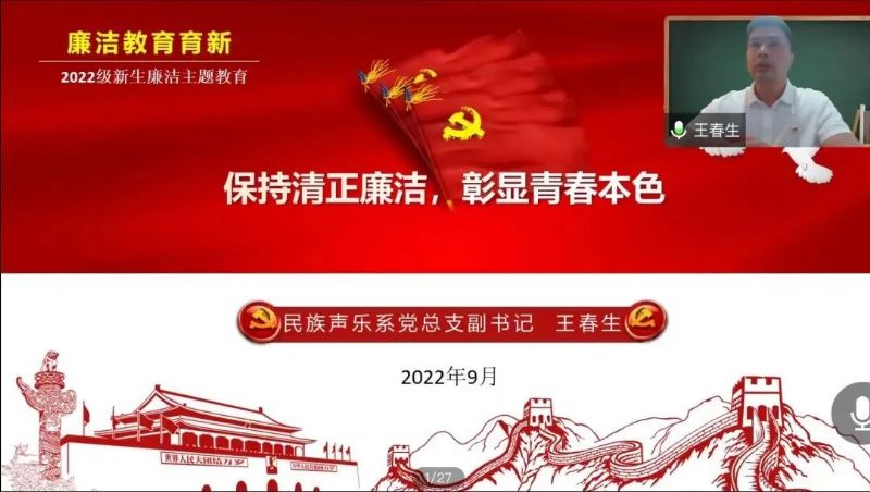 为深入学习贯彻习近平新时代中国特色社会主义思想,贯彻落实全国高校思想政治工作会议精神,按照加强新时代廉洁文化建设意见要求,落实立德树人根本任务,大力弘扬中华优秀廉洁文化,传承鲁艺精神,进一步引导新生涵养廉洁品格。10月1日,党总支副书记王春生为2022级新生上了“清正廉洁 彰显青春本色”廉洁教育第一课。