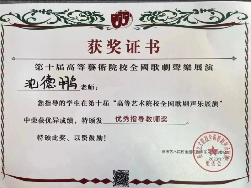 喜报|民族声乐系副主任沈德鹏教授荣获“高等艺术院校全国歌剧声乐展演”优秀指导教师奖