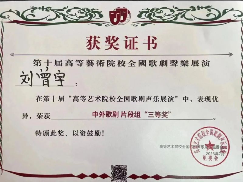 喜报|民族声乐系学生刘曾宇荣获“高等艺术院校全国歌剧声乐展演”三等奖