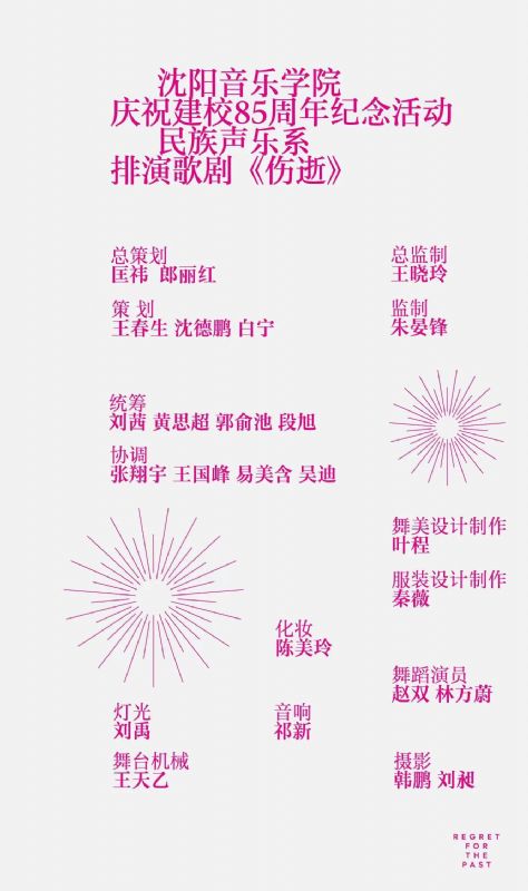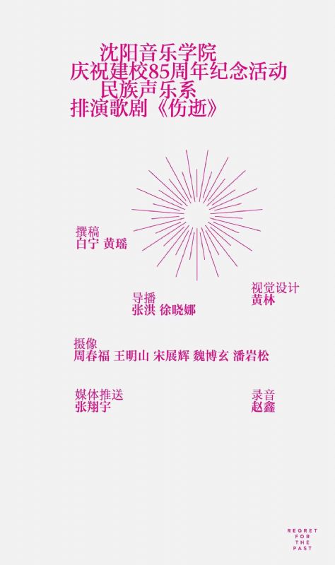 • 民族声乐系为庆祝沈阳音乐学院建校 85 周年而复排经典歌剧《伤逝》,将在 11 月 16 日19:00在沈阳音乐学院音乐厅上演,主要演员:子君由匡祎饰演,涓生由沈德鹏饰演,男歌者由张大伟饰演,女歌者由曹粹饰演,诚挚邀请各位领导、老师、朋友们莅临指导!