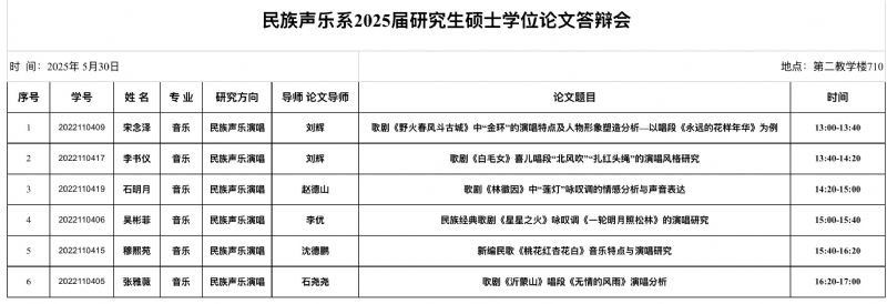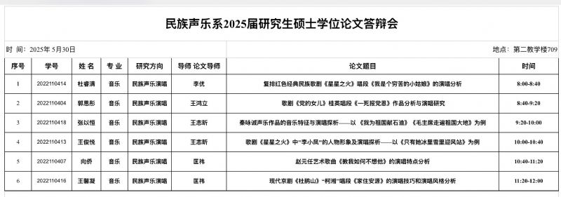 • 民族声乐系2025届硕士研究生学位论文答辩会拟于2025年5月30日(星期五),具体安排如下: