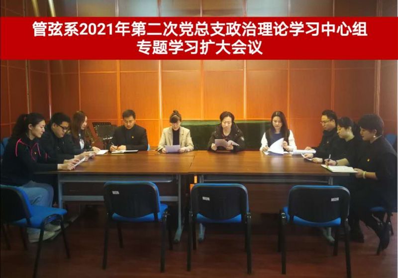 3月29日,管弦系召开党总支政治理论学习中心组学习(扩大)会议,集体学习2021年全国教育工作会议精神,习近平总书记在十九届中共中央政治局第二十七次集体学习、在党史学习教育动员大会、看望参加政协会议的医药卫生界教育界委员时的重要讲话精神等内容。党总支理论学习中心组成员参加会议,党支部书记、党支部委员会委员、专职组织员、专职辅导员列席会议。会议由党总支书记陈璐主持。